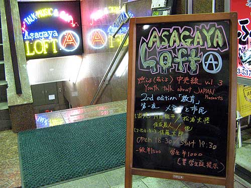 http://www.loft-prj.co.jp/lofta/松浦大悟って知らなかったけど、「不機嫌な日常」ってブログを開設してた人なんだって(本人談)。はっきりとは憶えてないけど、そのサイト、何か検索しててたびたび見かけたような記憶がある。それにずっとLOFT/PLUS ONEのお客さんで、宮台真司のイヴェントとかよく来てたんだって。そんな人がいつの間にか国会議員になっちゃってるって、なんか不思議。