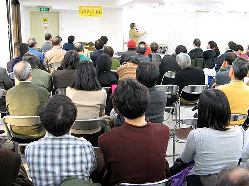 前列中央あたりで赤帽かぶって坐ってるお兄さんからいつだったかAsagaya / Loft Aでチラシをもらい、今日の講演会のことを知りました。