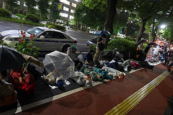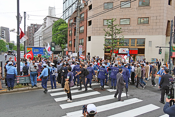 集合場所の仲良し公園から交代制で大使館を目指しましたが、日テレ通りを渡ったところで警察の規制線に阻まれ、案の定、大混乱でした。
