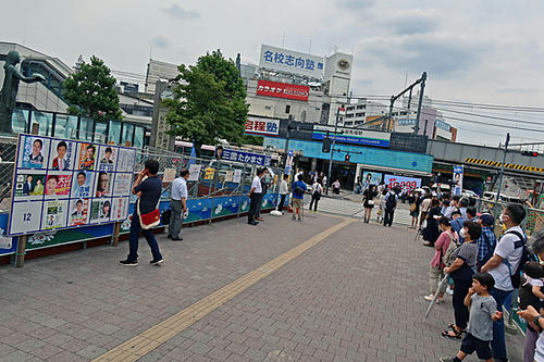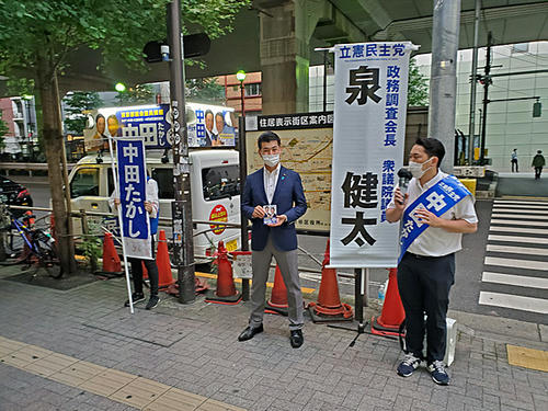 きんちゃんと夕方の散歩に出かけたら幡ヶ谷駅前に立憲民主党・中田たかし候補の応援で泉健太政調会長の姿がありました。