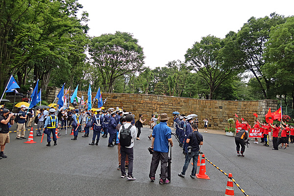 中国共産党結党100年の今日、警察による緩衝地帯を挟んで、民主派(左)と親中派(右)が対峙しています。