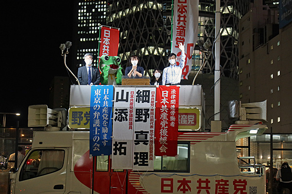 新宿西口で「日本共産党を励ます東京の弁護士の会」が街頭演説会をやってました。