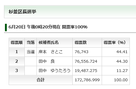 杉並区長選挙/杉並区議会議員補欠選挙 開票速報