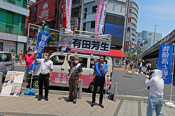 新宿駅東南口の階段を降りたら、立憲民主党 有田芳生候補(比例)がいました。