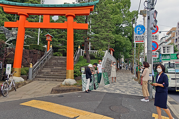 穴八幡宮で十二亀を眺めて亀パワーをもらおうと思ったら、柱脚部に亀のいる鳥居の前で、大山とも子都議たちが街頭宣伝してました。