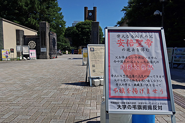 東大駒場の「国葬阻止」と「偉大なる人民の父 安倍聖帝の逝去を悼む」立て看、前から見にいきたいと思ってたのですが、なかなか果たせずにいたところ、今朝、東大立て看同好会のTweetを見てたら、当局から撤去通告との情報があり、朝一番で見にいきました。