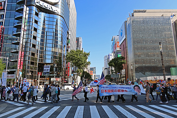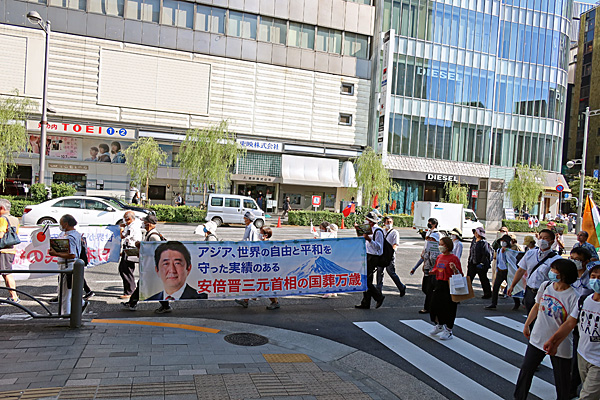 14時過ぎ、数寄屋橋交差点を安倍晋三国葬儀支持のサイレント・デモが通り過ぎていきました。
