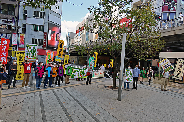 新宿駅東南口では、全労連系でしょうか、「めざそう!全国一律 最低賃金 時給1500円」と訴えてました。