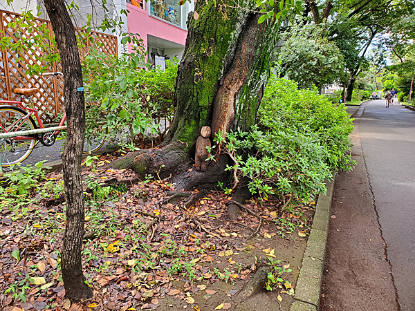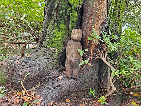 きんちゃんと朝の散歩をしてたら、緑道に木彫りの人形がいました。