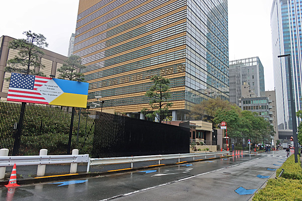 レイセオン抗議の行き帰りに撮りましたが、エントランス附近には米ウクライナ日本の旗、少し離れたところに米ウクライナの旗の間に「We stand with Ukraine 」と書かれた看板がありました。