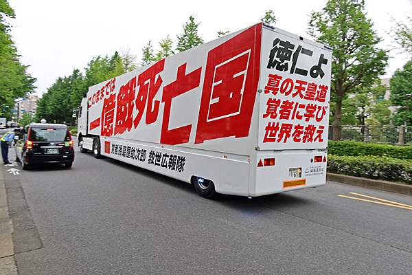 現在、「このままでは一億餓死亡国」の他に、「一億餓死亡国 天皇ノ責任」というのも街宣運行中のようです。