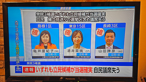 衆院3補選、島根1区、東京15区、長崎3区、いずれも立民候補にゼロ打ち当確が出ました。