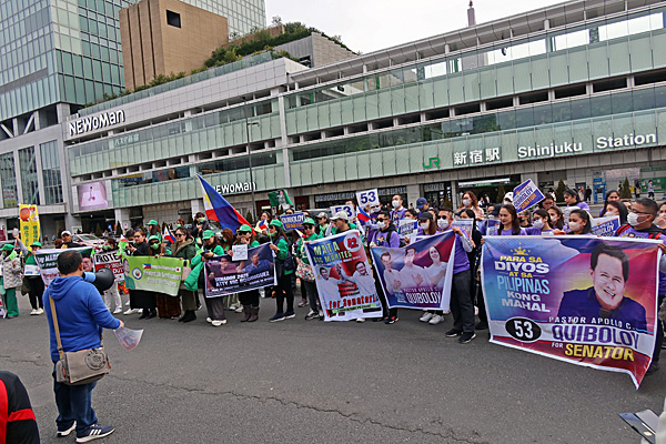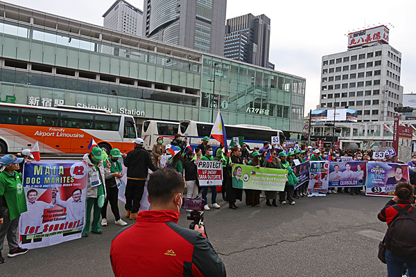 新宿駅南口に横断幕をいくつも拡げてフィリピンの人たちが大勢いました。