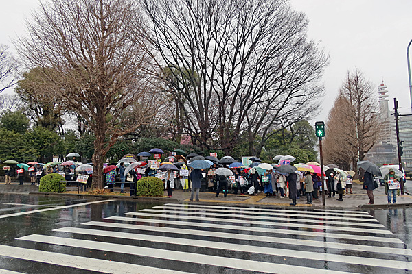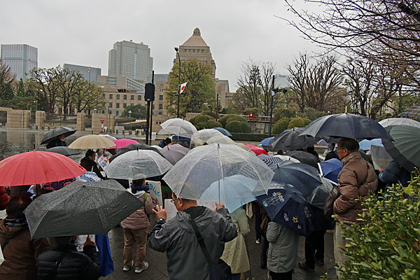 3月3日 午後1時、冷たい雨の降る中、国会正門前です。