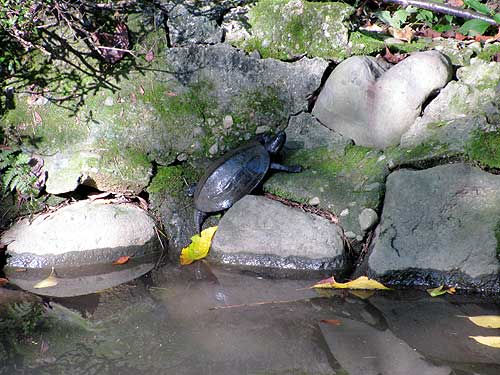 写真中央の緑の塊(水面に樹葉が映り込んでます)の少し下に、右向きに頭を出してるカメはかろうじてわかるかも。