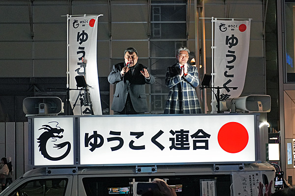 社民党・大椿ゆうこ候補の18時からの街頭演説を聴こうと新宿駅東口に来たら、なぜか「減税日本・ゆうこく連合」が街頭演説してました。