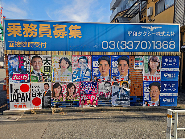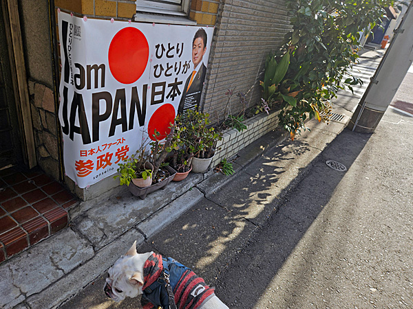 朝、きんちゃんと代々木郵便局の前の道を散歩してて、参政党の「I am JAPAN / ひとりひとりが日本」の2連ポスターの現物を初めて見ました。