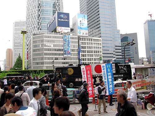 その後ろの車道に右翼の街宣車が続々と集結してきました。