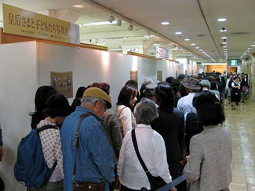 あら、写真展は8階じゃないの? 昨日TVで写真展の紹介やってたでしょ、それで列が7階までつづいてるんですよ。あらあら、そうなんですか。でもTVでは以前から写真展の紹介してたわよねえ。いえいえ、昨日は皇后さまのお誕生日でしたでしょ、それで紹介をちょっと長めにやったんですよ。土曜日に両陛下が3人のお子さま方と展示を見てまわられてましたよね、それでじゃないかしら。。。