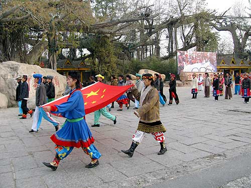 偶然そのとき少数民族の衣裳を着た人たちが何十人も中から出てきて、道路に面した広場でおもむろに国旗掲揚を始め、次いでみんなで踊り始めました。