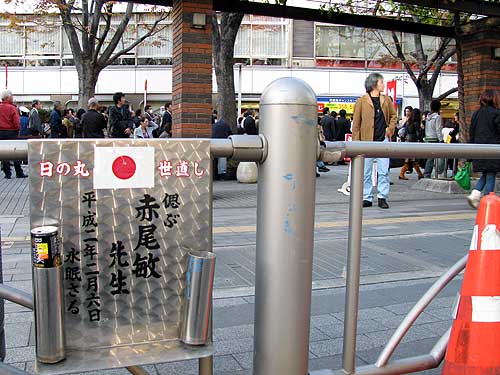 現場では缶コーヒーに目がいって気がつかなかったのですが、家でPCで写真をつくづく眺めてたら、右の花挿しとその隣りのポールに何か青い色が附着してますね。