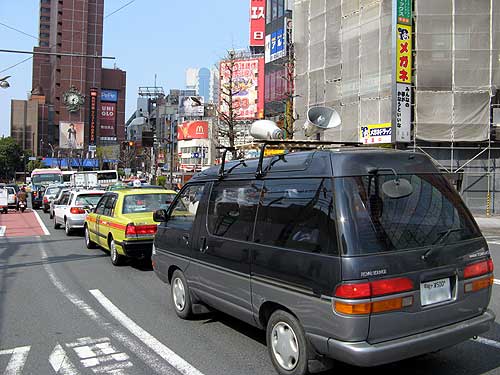 追分交番の隣りのUFJ銀行から出てきたら、おととい選挙は終わったはずなのに、何かがとんでもない音量で聞こえてきた。