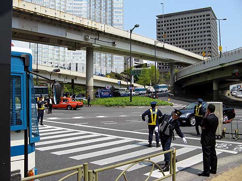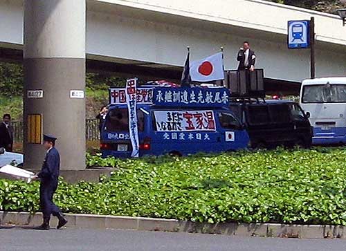 小さすぎて読めないと思うけど、画面中央あたりの大日本愛国党の青い街宣車、「温家宝にだまされるな!」って書いてあるのかな。
