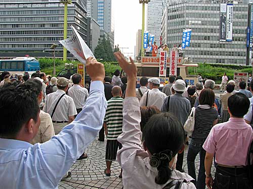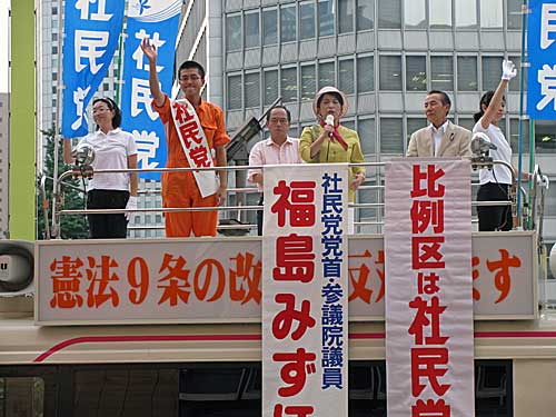マイクを握ってるのは福島瑞穂党首、オレンジ色のつなぎは池田一慶候補。