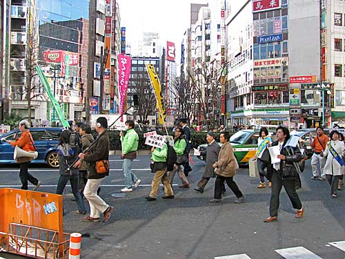 柏木公園を出発した時点では十数人しかいなくて、随分さびしいデモだなあ、と思ったのですが、大ガードをくぐった頃にはいつの間にか二十数人までふくらんでました。