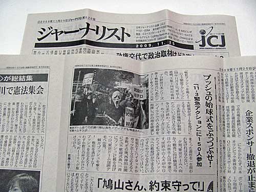 たすきデモから戻ってみると、今頃になってJCJ(日本ジャーナリスト会議)から「戦犯ブッシュを裁く! 11.3緊急アクション」の記事が載った「ジャーナリスト」(09年11月25日発行)が送られてきてました。
