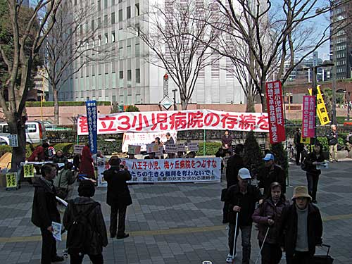 ママの見舞いに行く道すがら昼にちょっと寄ってみましたが、隣りの「都立3小児病院の存続を」の情宣の方がはるかに目立ってました。