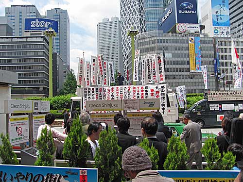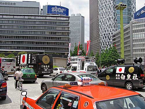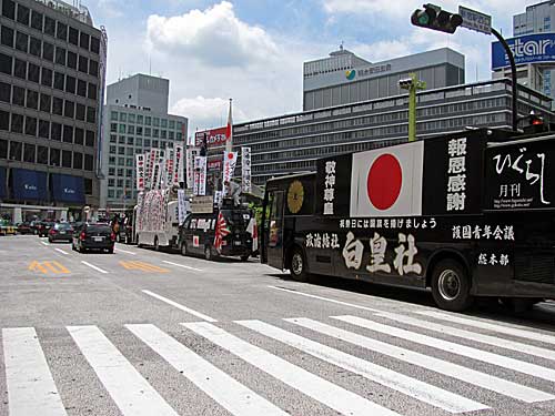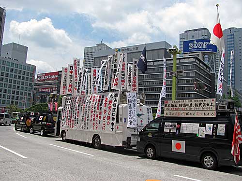 それで朝、見にいったら、西口地上にはしばしば見かける右翼の街宣車がずらっと並んでて、壇上の弁士が何か怒って叫んでました。