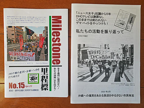 差別・排外主義に反対する連絡会のパンフレット「Milestone 里程標 No.15」と沖縄への偏見をあおる放送をゆるさない市民有志のパンフレット「私たちの活動を振り返って 2022年版」をもらいました。